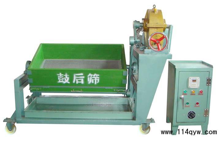 本設備為移動式(也可為固定式),在機器下裝有4個滑輪,可自行推動,移動靈活,使用方便,卸料時,只要把木框打開,搖動手搖把,就會將料卸到下面的接料盤上。篩子的控制是用自動計時控制儀進行控制,到達設定的時間時,篩子會自動停止。