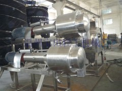 工作原理:上道工序來的番茄進入頭道物料桶內,主軸帶動葉輪高速旋轉,物料被葉輪帶動與篩網磨擦擠壓,使得番茄的肉、汁與皮、籽分離,肉和汁通過篩網上的小孔進入二道物料桶內,皮和籽則向軸端推進經過排渣口排出,二道物料桶結構與頭道相同,只是二道篩網網眼直徑更小,主軸轉速更高。