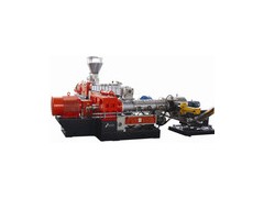 第一階為SHJ型高速同向平行雙螺桿混煉機(jī),第二階為SJ型低速單螺桿擠出機(jī),兩者呈垂直正交布置,構(gòu)成雙階式復(fù)合混煉擠出機(jī)組。