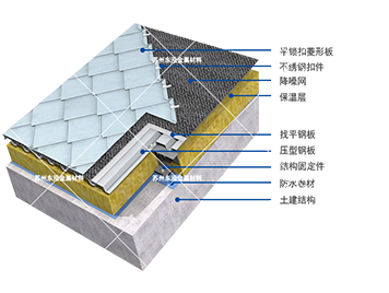 | 5、安裝平鎖扣鈦鋅板或平鎖扣鋁鎂錳板,0.5mm厚不銹鋼扣件,每塊板4個固定座; |