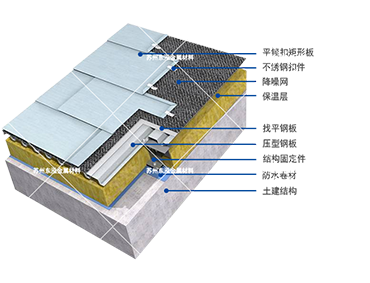 | 5、安裝平鎖扣鈦鋅板或平鎖扣鋁鎂錳板,0.5mm厚不銹鋼扣件,每塊板4個固定座; |