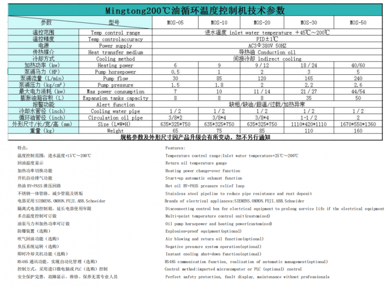 常州模溫機:簡稱模具溫度控制機,模具恒溫機,溫度控制設備媒介一般為水或?qū)嵊停訙睾屠鋮s兩個方面的溫度控制。具有全自動控溫數(shù)十種安全保障措施的優(yōu)點,基本上是一個先快速升溫,預熱,然后是保溫的,恒溫,冷卻等模溫機控溫范圍:生產(chǎn)的水式模溫機有45-120℃的普通型,45-150℃的高溫型的,高溫可達180℃型的機型,油溫機普通型45-200℃,高溫型45-300℃,特高溫型45-350℃,控溫精度±1℃。模溫機的優(yōu)點:自行研發(fā)的第4代型PC板,具備:自動加油,自動冷卻關機 開機自動冷卻排氣 加油(水)溫度顯示 缺油(缺水) 超溫 泵過載 泵反轉(zhuǎn) 模具回油(回水)溫度保護 故障狀況顯示等多項功能 采用OMRON雙組PID溫控器,控溫精度為±1℃ 穩(wěn)定可靠,省電35%。功率大小可根據(jù)客戶生產(chǎn)要求及均勻性能穩(wěn)定,節(jié)能,提高產(chǎn)品的質(zhì)量和速度特殊機型:雙機一體 ,多機一體機型,冷熱一體型, 防爆型等特殊機型可接受訂制。
